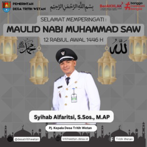 PEMERINTAH DESA TRITIH WETAN MENGUCAPKAN “SELAMAT MEMPERINGATI MAULID NABI MUHAMMAD SAW 12 RABIUL AWAL 1446 H” oleh admindesa | Sep 15, 2024 | Kabar Desa | 0 Komentar Bagikan Berita Kirim Komentar Batalkan balasanAlamat email Anda tidak akan dipublikasikan. Ruas yang wajib ditandai *Komentar * Nama * Email * Situs Web Simpan nama, email, dan situs web saya pada peramban ini untuk komentar saya berikutnya. Δ